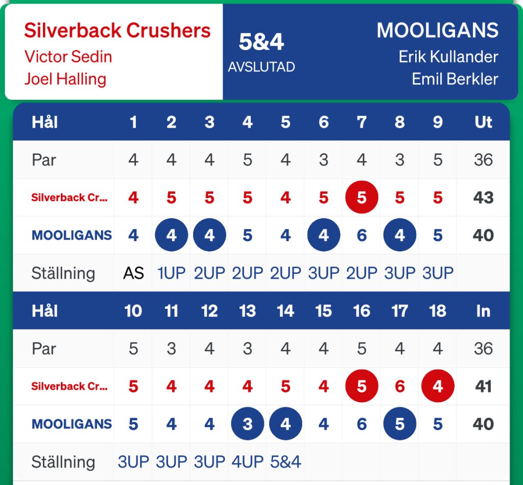 Brollsta GK, 22 juni 2025, 08:30 – Det var tidig tee time, klarblå himmel och en känsla av nytändning i luften när Silverback Crushers tog emot Mooligans i säsongens andra returmöte. Men när sista putten föll stod det klart: Mooligans vinner igen – denna gång med 5&4 och en hålskillnad på 7–3.